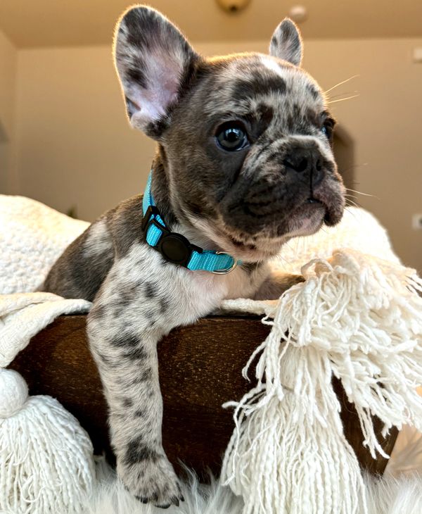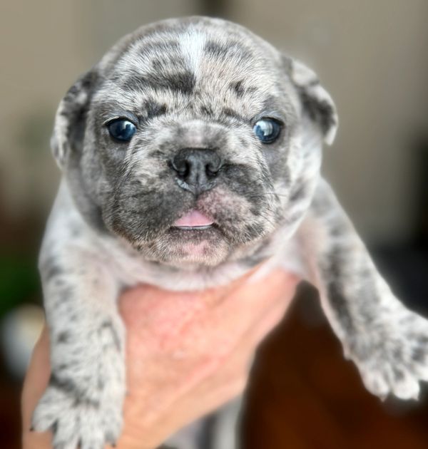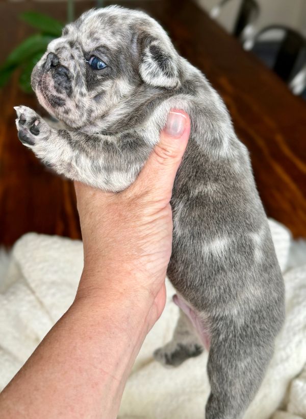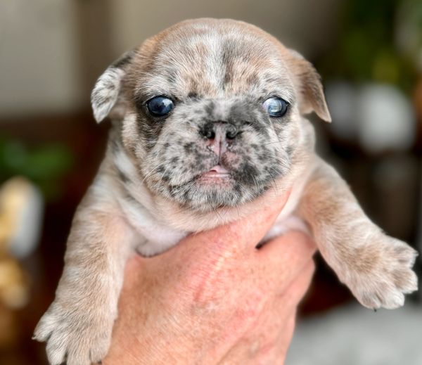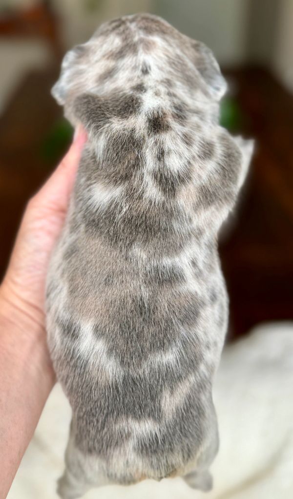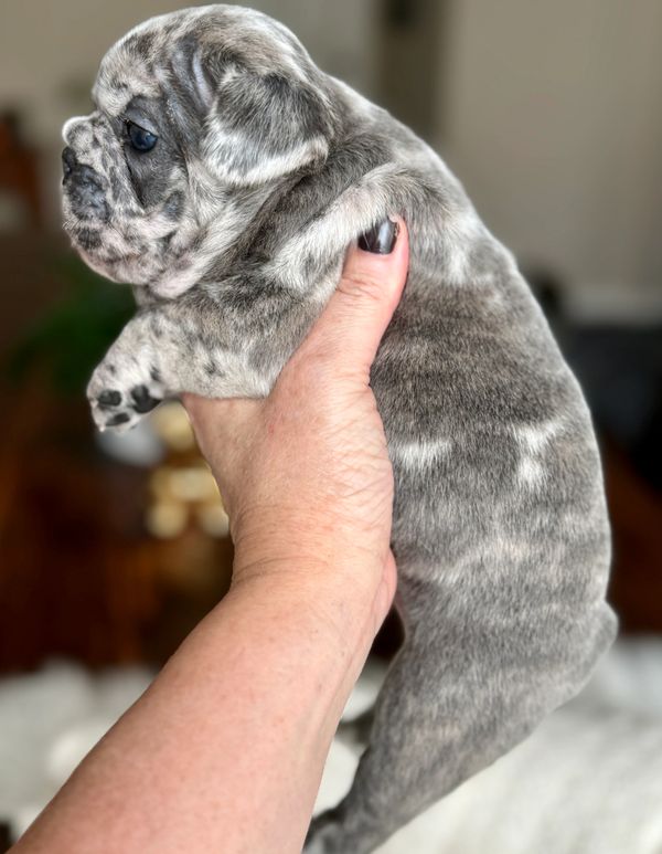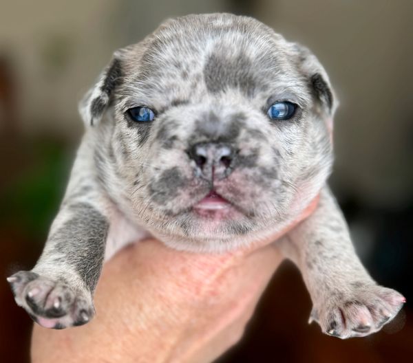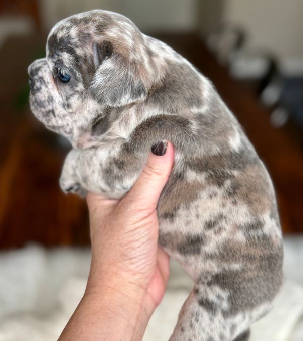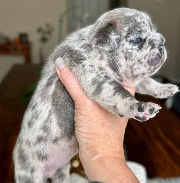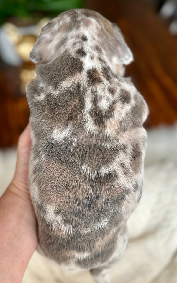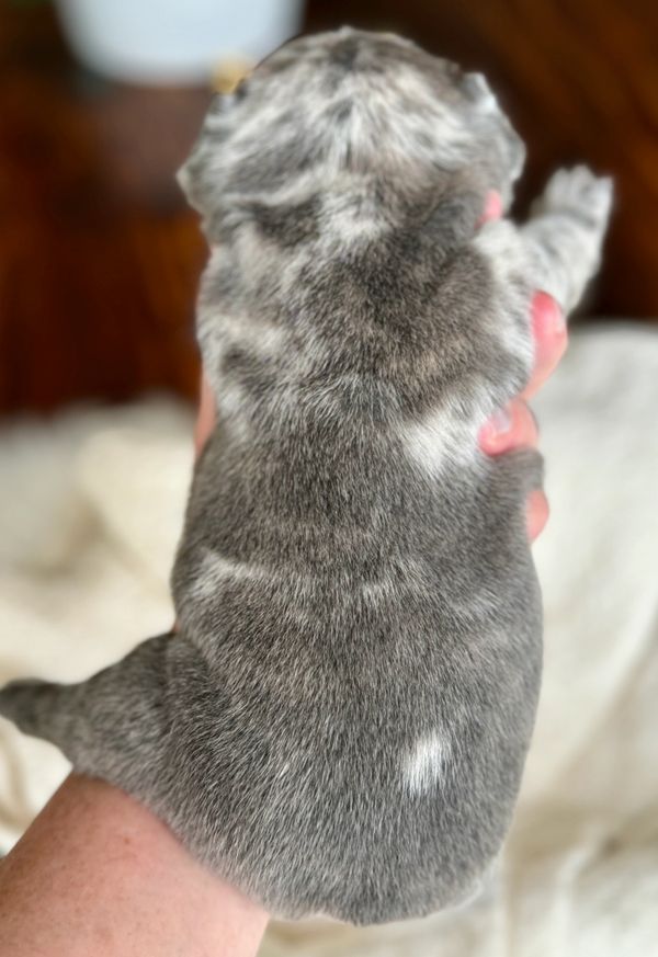 Blue Brindle Merle. Is growing up to look just like his dad.