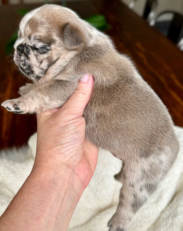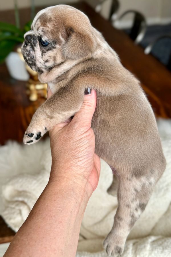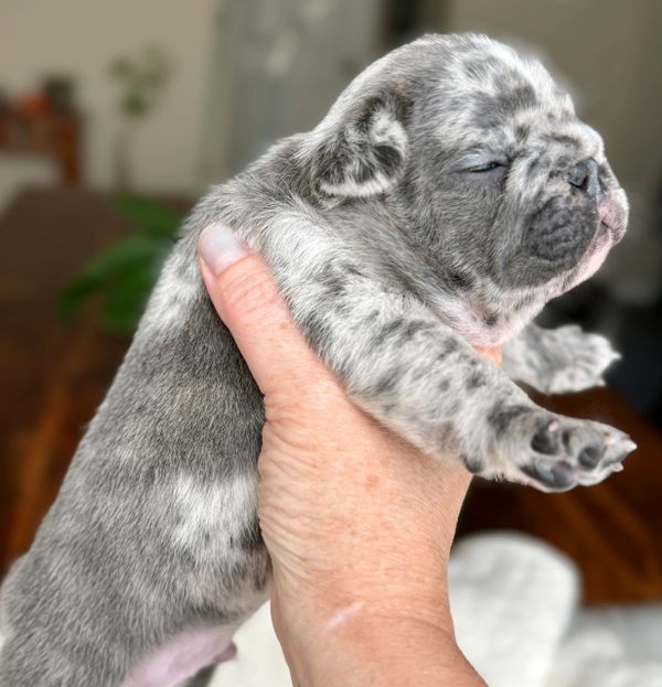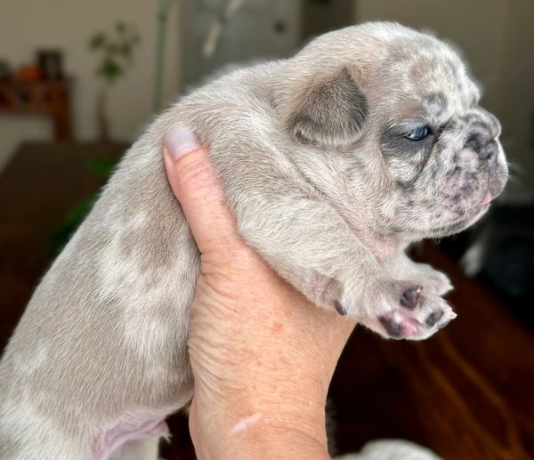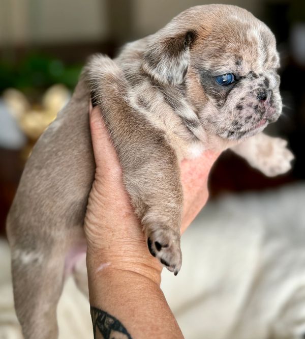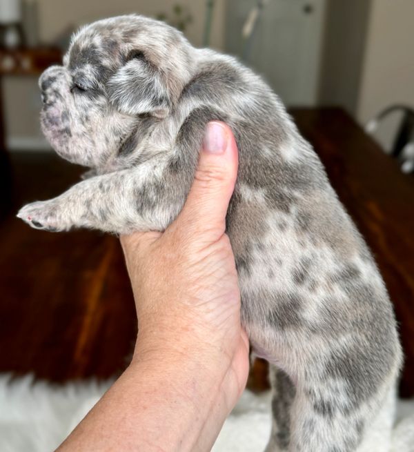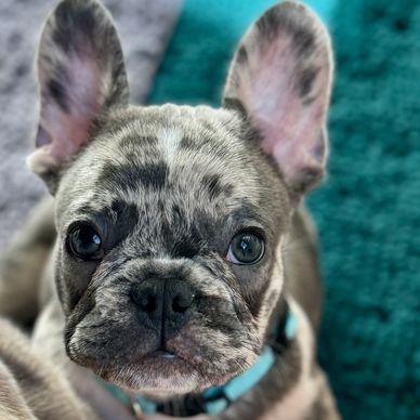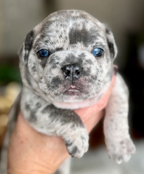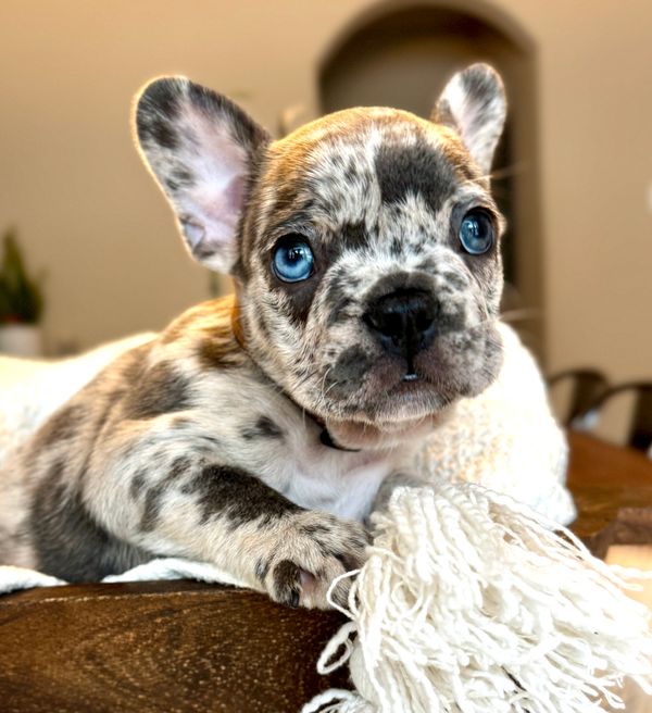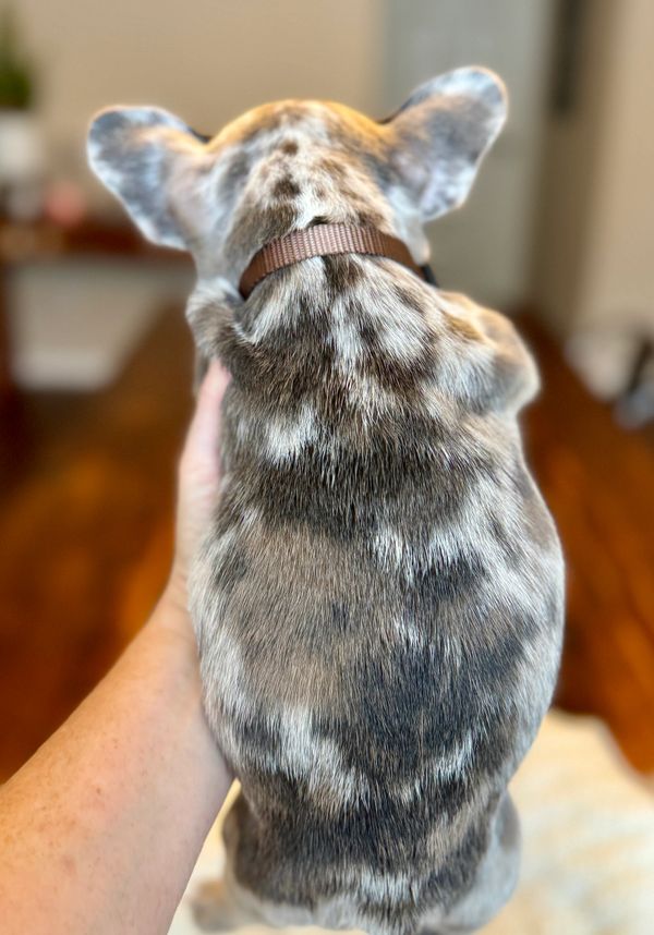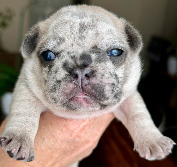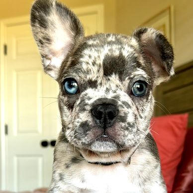Blue Brindle Merle. Is growing up to look just like his dad.
