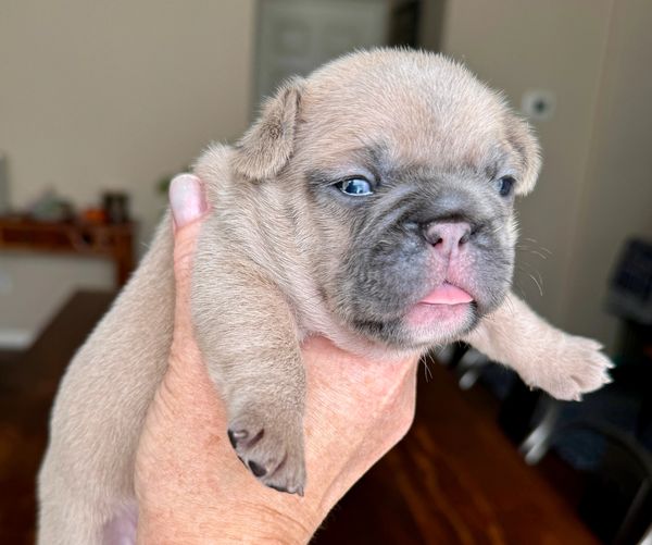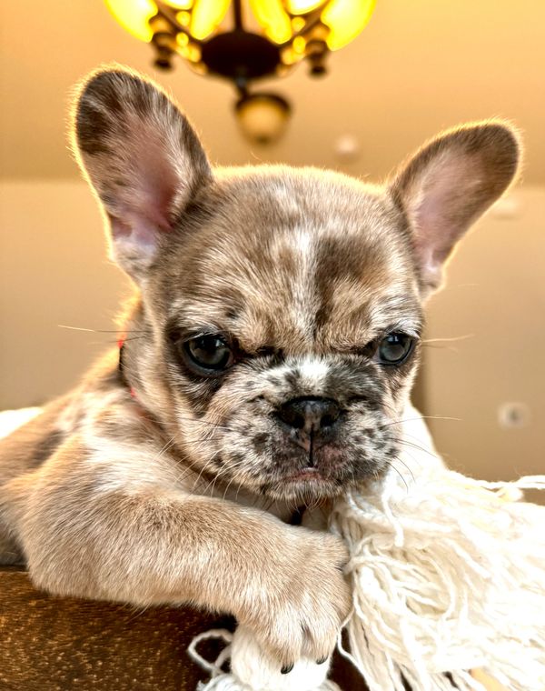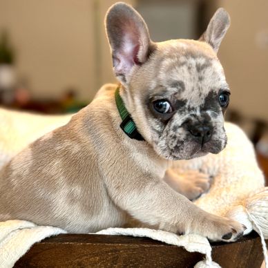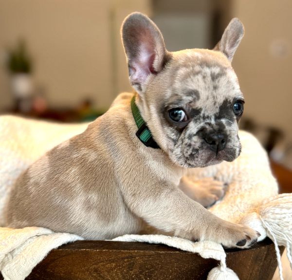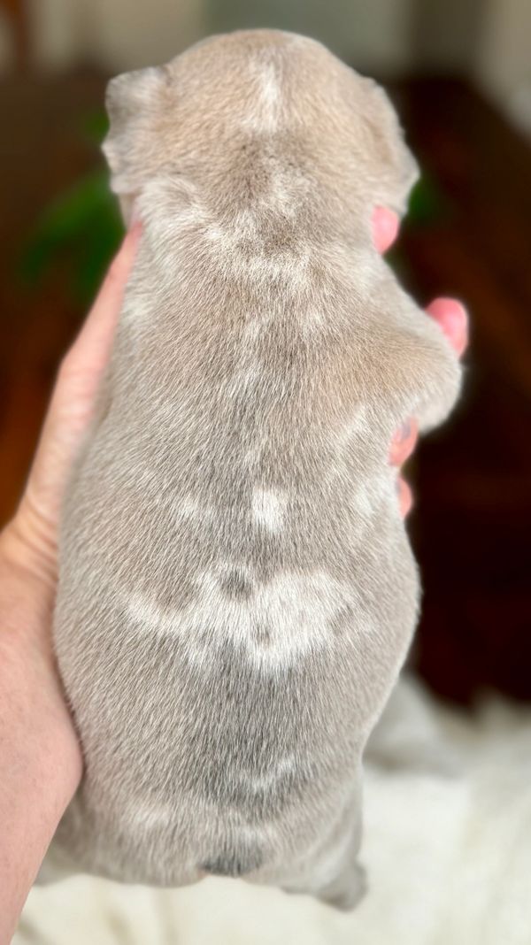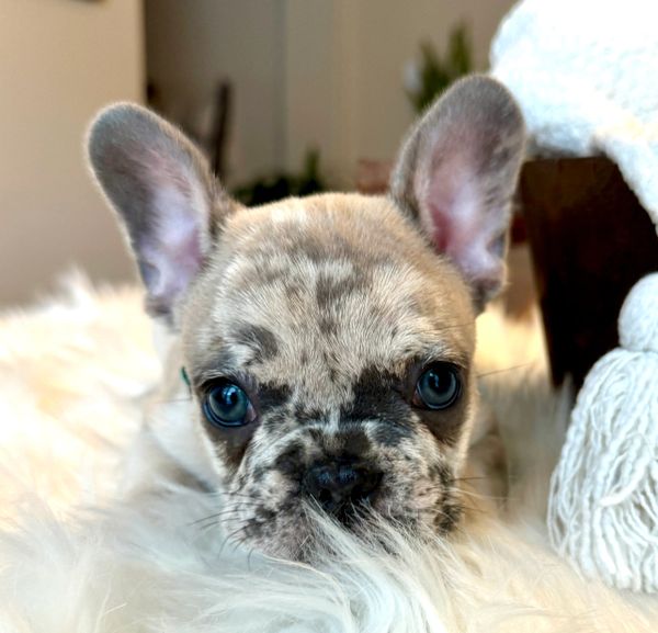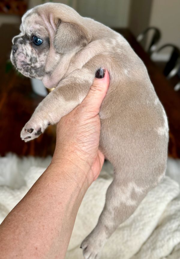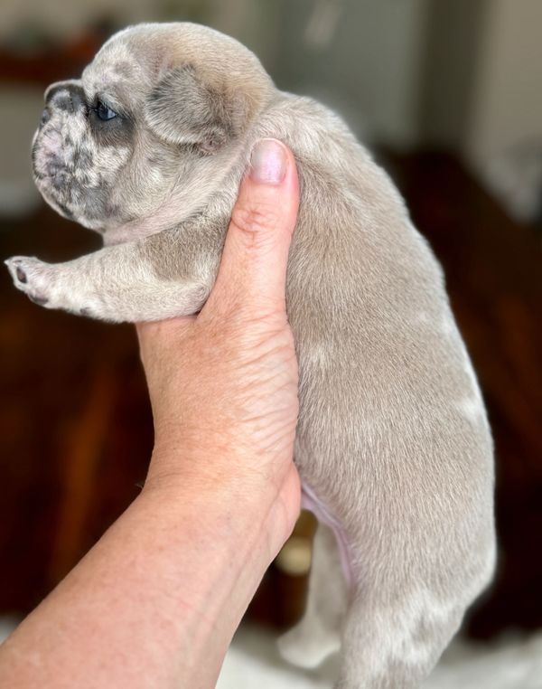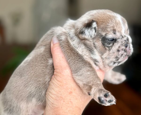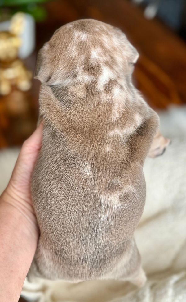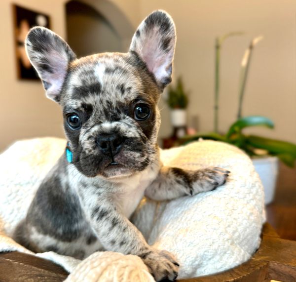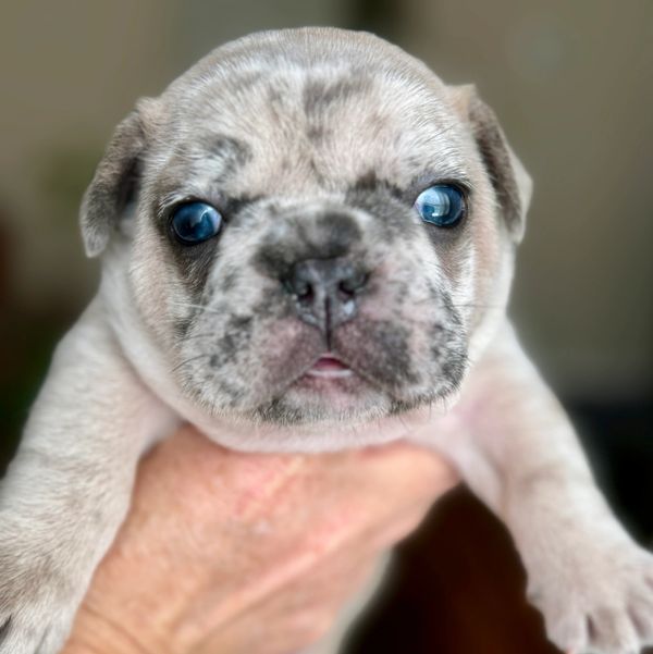 Blue Brindle Merle. Is growing up to look just like his dad.